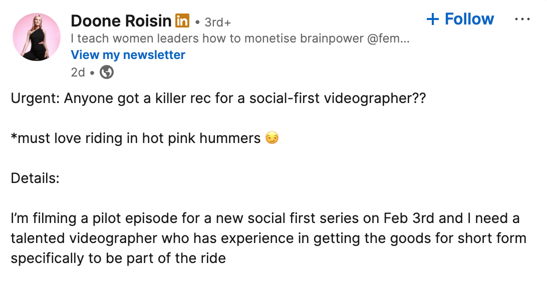💝 Social-First Videographer @ FSC (freelance) → Ride in hot pink Hummers, shoot a new short-form series pilot, capture internet gold, and work with ✨moi✨. If you get short-form and can move fast drop me your best work.